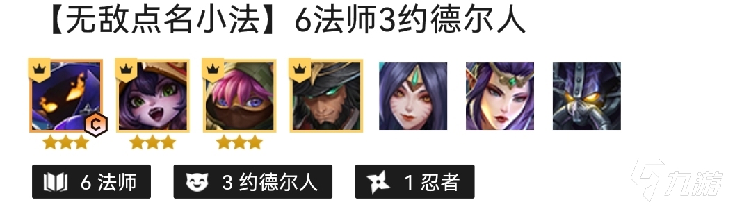 陣容的組成也是非常簡單的,由小法,露露,凱南,卡牌,狐貍,莫甘娜和卡薩丁組成,可以組成羈絆六法師,三約德爾人以及一個凱南的忍者羈絆,六法師可以給予整體陣容一個非常不錯的法術(shù)強度加成,能夠讓小法師的輸出能力變得非常強大。