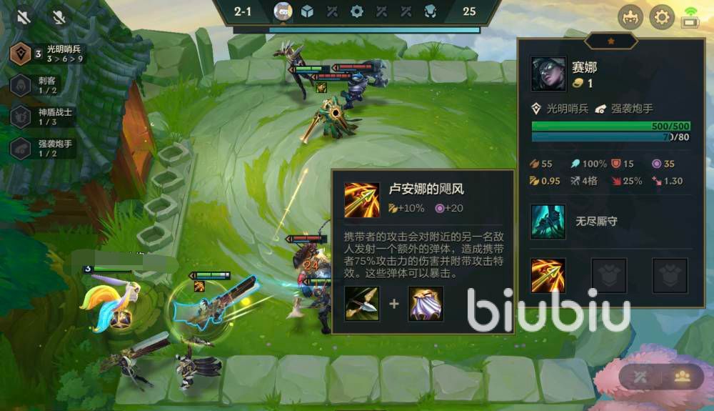 由于賽娜本身是個(gè)射手,并且光明哨兵這個(gè)羈絆本身就會(huì)給她增加一定的攻擊速度,所以在出裝上,我們可以最大化她的攻擊范圍,前期搶貝殼以及反曲弓來(lái)合成盧安娜的颶風(fēng),這樣她攻擊到的目標(biāo)也就越多,回復(fù)的藍(lán)量也就越快,這樣基本上每平a2~3下就可以釋放出技能,眩暈敵人,并且造成法術(shù)傷害了。由于她本身是個(gè)炮手,并且?guī)Хㄐg(shù)傷害,羊刀也是一個(gè)不錯(cuò)的選擇,給她在持續(xù)戰(zhàn)斗中,可以提供越來(lái)越快的速度,最后我們?cè)俅钆湟粋€(gè)青龍刀,每次平a敵人回復(fù)法力值,這樣她技能釋放頻率就會(huì)變得最快。