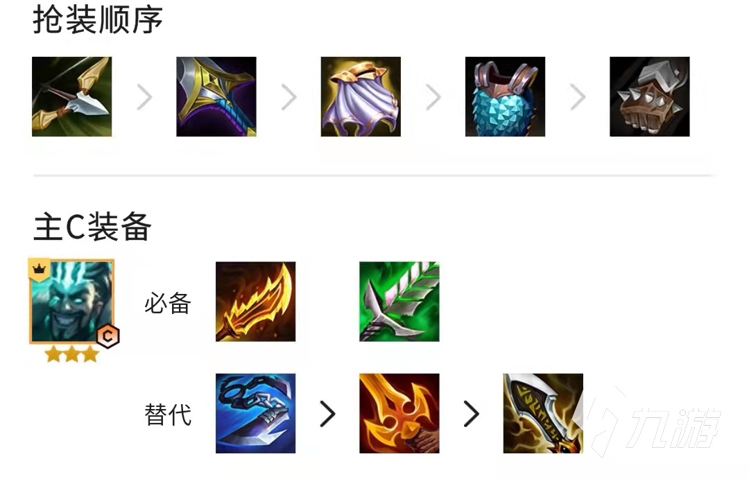 德萊文主C3件套:羊刀、飲血劍、巨人殺手,前兩件必備可以靠賣血搶裝備,最后一件巨殺可以用無盡代替,但效果不及巨殺,而且最近德萊文被削了一刀,無盡的缺點更明顯了。