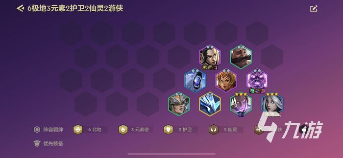 極地游俠這套陣容究極成型是在8人口的時(shí)候,陣容當(dāng)中的英雄包括豬妹、鐵男、冰鳥、千玨、狗熊、薇恩、維魯斯、寒冰。在這個(gè)陣容當(dāng)中,豬妹、冰鳥、狗熊、寒冰組成了4級(jí)地,千玨、薇恩、維魯斯、寒冰則有四游俠羈絆,鐵男和千玨還有額外的暗影羈絆加成。