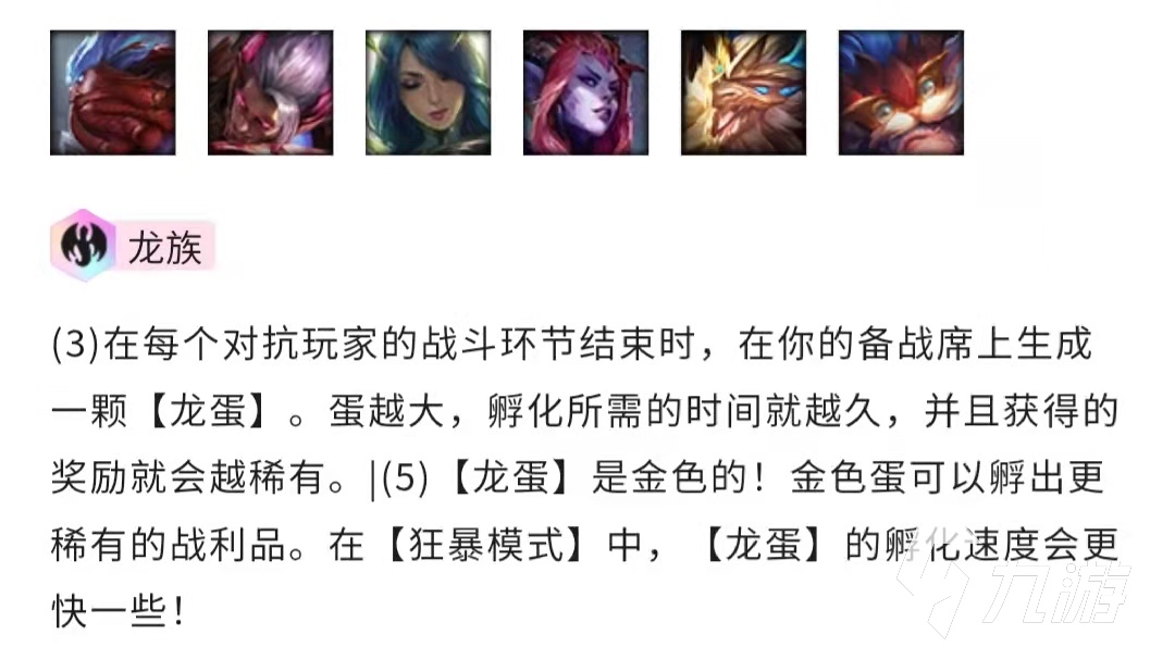 游戲中只有一個羈絆是可以孵蛋的,就是龍族,這個版本龍族一共有6個英雄:烏迪爾、瑟提、艾希、婕拉、加里奧、黑默丁格,分別對應1、2、2、3、4、5金幣,前期的話玩家可以先湊出3龍族的羈絆過度,有龍族羈絆后每回合與其他玩家對戰(zhàn)結(jié)束都能獲得一顆龍蛋,體積越大的龍蛋孵化的時間越久,給的獎勵也就越好,所以用龍族的情況下戰(zhàn)斗力會下降很多,前期就可以賣血先拿裝備。