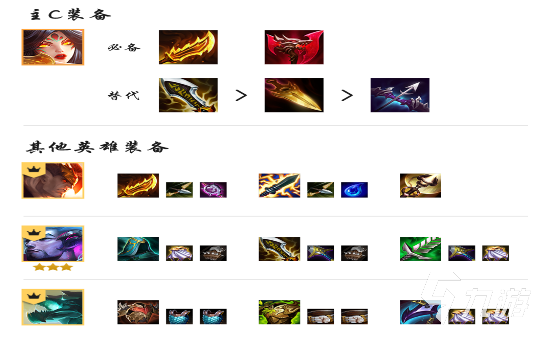 陣容主C霞,必備羊刀(加攻速)和金鱗龍裝備德萊文之斧(加攻速和攻擊力并且疊滿一百層提供巨額金幣和裝備),剩下的可以帶無盡(加暴擊率和暴擊傷害)或者投機者之刃(加攻速和法強)或者輕語(加暴擊和穿甲)。