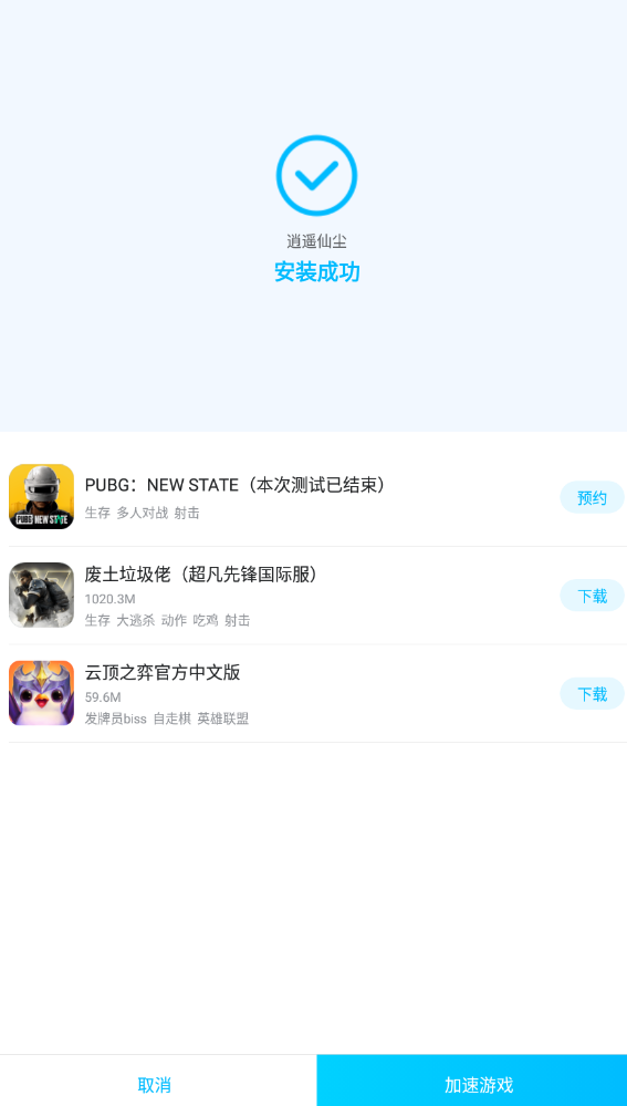在完成了這款游戲的安裝之后,系統(tǒng)會(huì)告訴玩家這款游戲已經(jīng)安裝完成,屆時(shí)玩家只需要滑動(dòng)到該界面的最下側(cè),點(diǎn)擊最下側(cè)的加速游戲選項(xiàng),就可以開(kāi)始游戲的加速了。