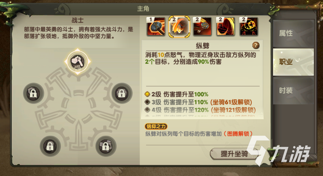 第一個(gè)推薦的是縱劈技能,這個(gè)技能使用會(huì)消耗十點(diǎn)的怒氣值,在技能里面算是比較少的了。在攻擊方式上會(huì)對(duì)敵人縱列的兩個(gè)目標(biāo)造成傷害,傷害的量是物理攻擊的90%。這個(gè)傷害的基礎(chǔ)看起來(lái)不高,但是在有了物理攻擊的騎寵加成之后,輸出能力還是很不錯(cuò)的。而且該技能冷卻也是相對(duì)較短的,實(shí)戰(zhàn)中是可以多次使用的。