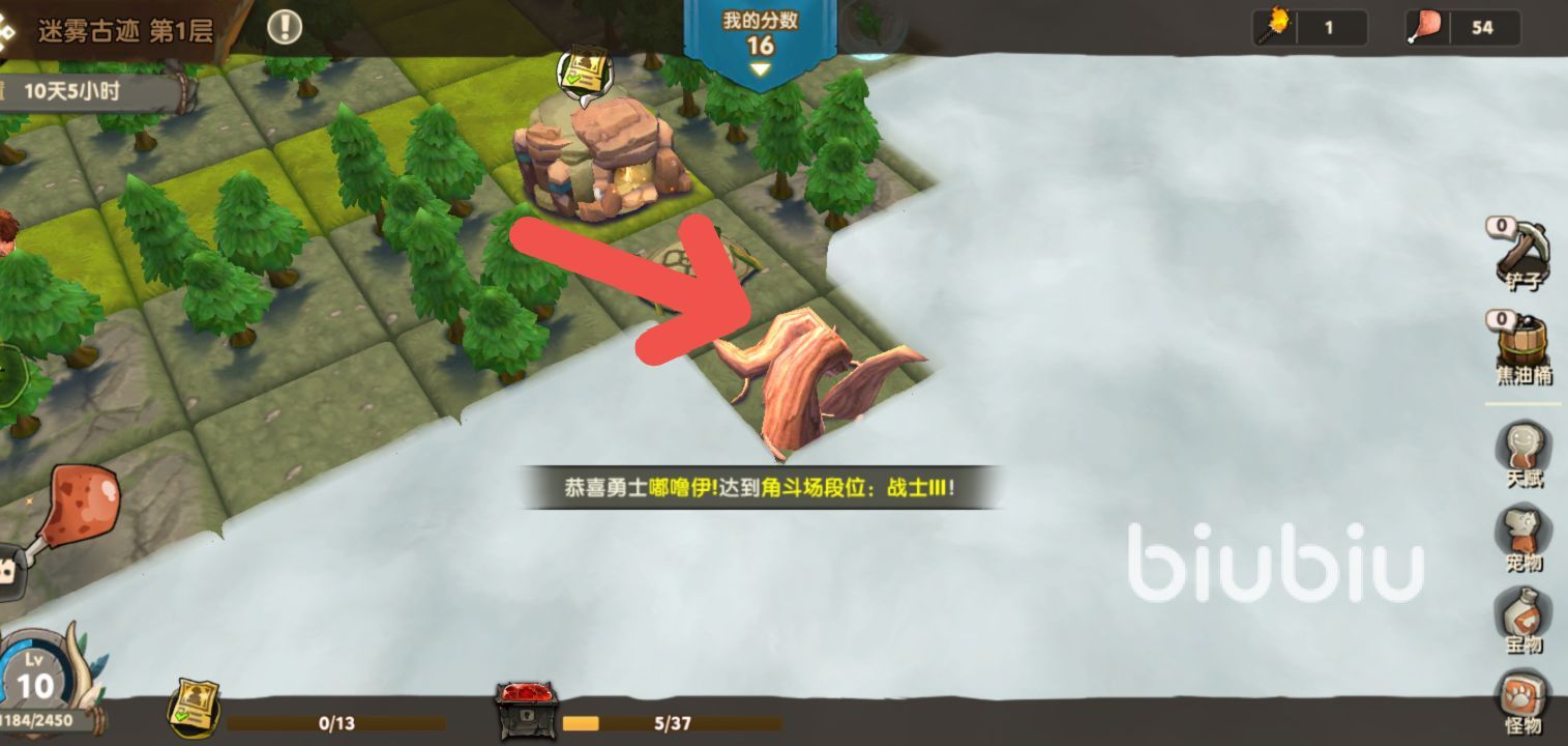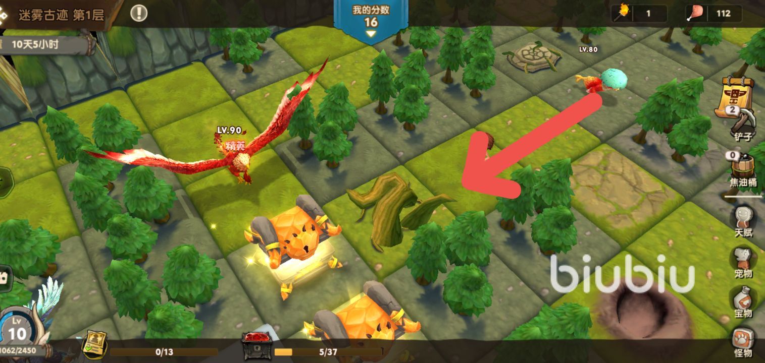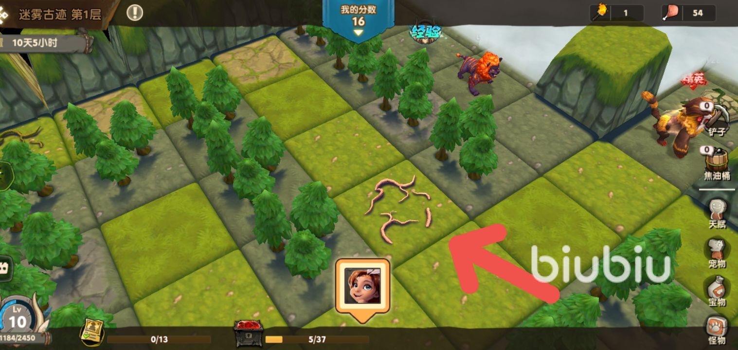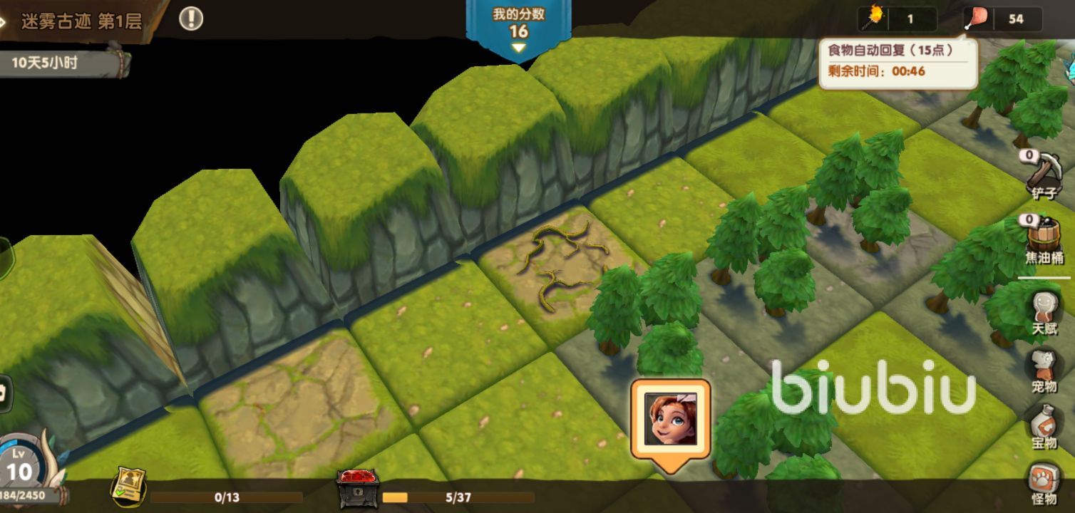首先在迷霧古跡中的玩法,主要就是操縱自己的主角來通關前方放置的一些門檻,一般來說,每次遇到怪物都需要消耗食物這個東西進行戰(zhàn)斗,但是也有其他的道具可以幫助我們前進,就比如說鏟子,可以在自己所在的區(qū)域原地進行挖掘,可以獲得寶物獎勵,再比如說膠油桶,可以直接轟炸到周圍的八個格子,清除樹木這種無法通過的障礙物。