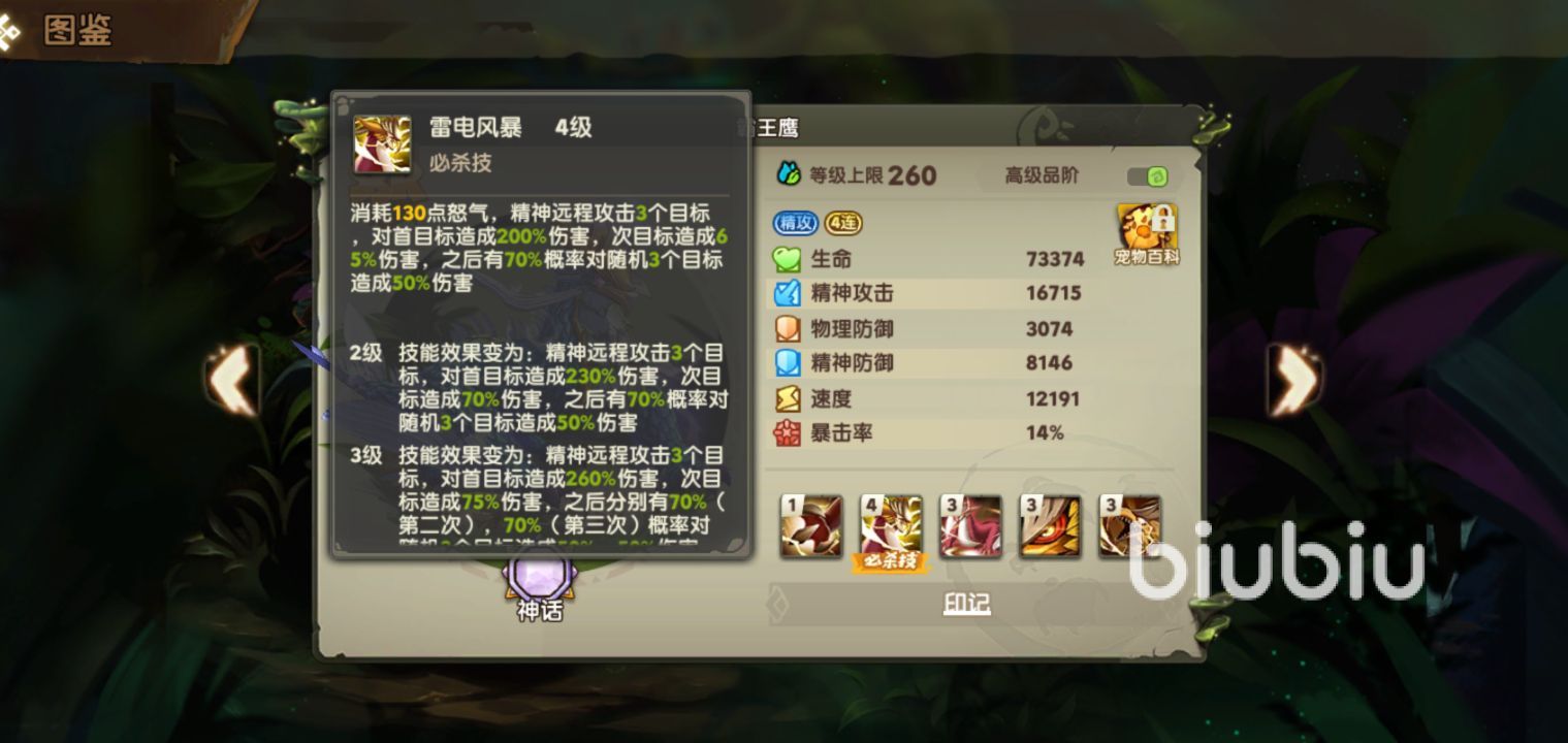 第二個(gè)寵物就是大家渴望不可及的霸王鷹,作為僅有的四個(gè)ssr寵物中的一個(gè),不通過ssr輪盤旋轉(zhuǎn)是無法獲得的,這個(gè)寵物它的必殺技,對(duì)敵方三個(gè)目標(biāo)造成精神遠(yuǎn)程傷害,并且還會(huì)有70%的概率再次使用這個(gè)技能,對(duì)三個(gè)目標(biāo)造成隨機(jī)傷害,如果人品好的話他的這個(gè)技能可以一直連到敵方單位陣亡而止,十分可怕。