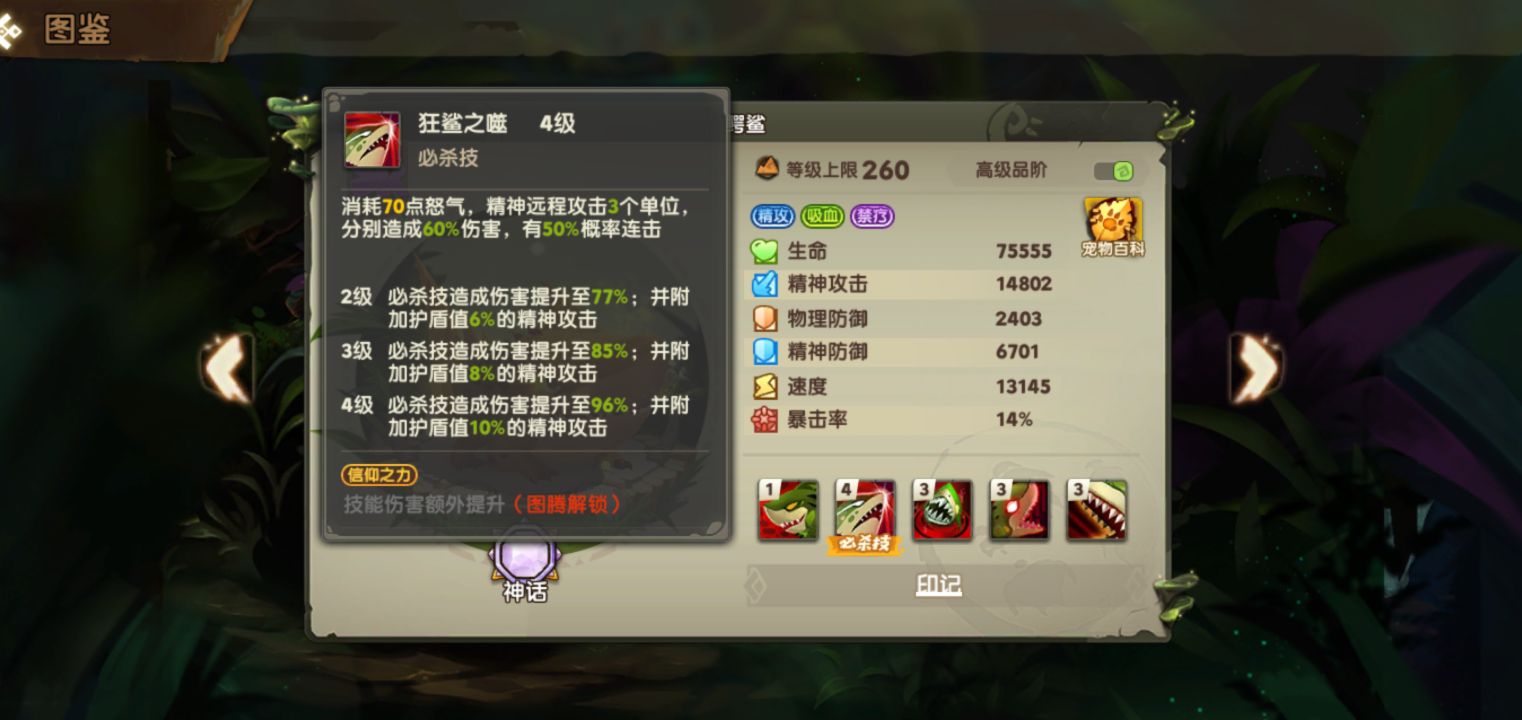 第三個(gè)群傷比較厲害的就是鱷鯊,這個(gè)寵物它的必殺技是攻擊敵方三個(gè)單位,雖然并沒有其他特色,但是還會(huì)有50%的概率連擊,連擊的意思就是說,可能再次使用必殺技進(jìn)行一次攻擊,這就和前面提到的霸王鷹是同樣一個(gè)道理,其實(shí)他的攻擊最變態(tài)的地方還在于可以吸血,而且還可以禁止治療敵方寵物,可以很好的克制一些犀牛鯨,蛙眼豚這種強(qiáng)力恢復(fù)性的奶媽。