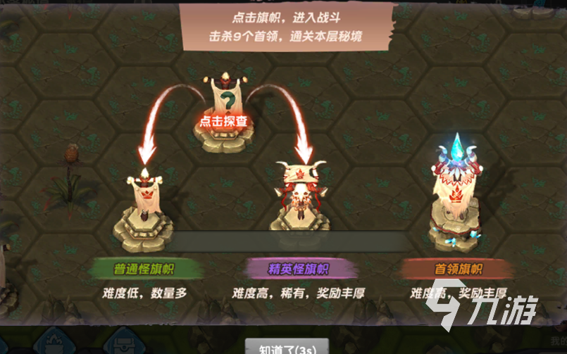 旗幟的類型也是很好分辨的,綠色的就是普通敵人的旗幟,紫色的就是精英敵人的旗幟,橙色的就是首領敵人的旗幟。點擊旗幟之后就會進入到挑戰(zhàn)的界面中,點擊開始即可進入到戰(zhàn)斗中。除了這幾個基礎的旗幟之外,還有一個特殊的問號旗幟。問號旗幟的敵人是隨機的,有可能會出現(xiàn)精英敵人,也有可能是普通的敵人。