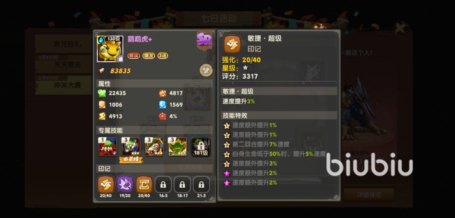 另外一種進(jìn)化鸚鵡虎的方法就是添加印記,這需要玩家們通關(guān)12-1回合關(guān)卡之后,才會(huì)解鎖印記玩法,在這里小編推薦大家攜帶超級(jí)吸血印記,在造成物理攻擊的時(shí)候,就會(huì)將造成傷害的4%治療自己,而且如果自己血量滿的話,還可以與自己的被動(dòng)技能虎威疊加轉(zhuǎn)化成護(hù)盾,這樣就保證了整個(gè)隊(duì)伍的存活能力,而重?fù)暨@個(gè)印記,在物理攻擊的時(shí)候,有8%的概率提升攻擊力,暴力猩提供的連擊效果都是可以增加攻擊力的。另外作為騎寵沒(méi)有速度是很尷尬的,在這里推薦多攜帶幾個(gè)進(jìn)化的敏捷印記,可以在隊(duì)伍中擁有著超強(qiáng)的先手能力,在游戲外地圖中逛游的時(shí)候,移速也是很快的,省去很多時(shí)間。