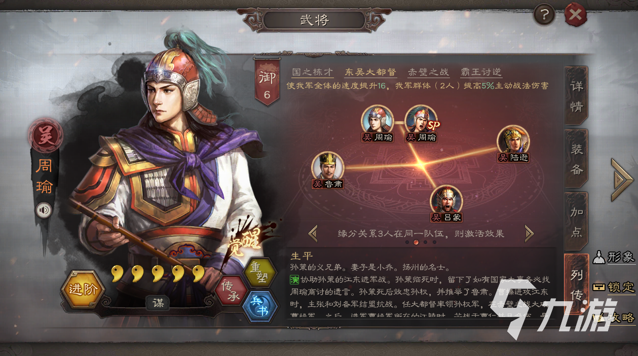 周瑜:周瑜坦度不夠,因此必帶【奪魄攜魂】,然后再搭配高發(fā)動率的【智計】【嬰城自守】均可。