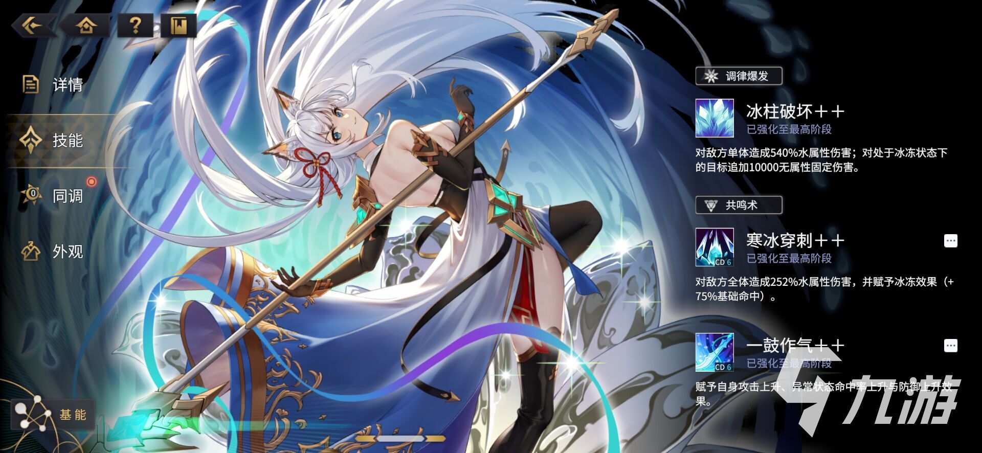 六花共鳴術(shù)強(qiáng)度:寒冰穿刺也就是她的一技能可以對敵方全體造成水屬性傷害的同時,有很高的命中率給敵方全體施加冰凍效果,這再配合上奧義爆發(fā)技能,所打出來的傷害有多恐怖就不用多說了吧,尤其是水隊的其他角色,也有冰凍的效果,可以幫助六花最大化它的傷害。
