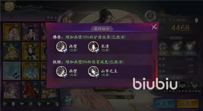 長(zhǎng)清和畫(huà)壁一起上陣可增加長(zhǎng)清15%的防御力,還可以增加畫(huà)壁10%的護(hù)盾效果,玳瑁和鷹虎神基本可以增加鷹虎神8%的防御,這幾個(gè)人同時(shí)上陣都存在肉盾羈絆大大增加了其前排的坦度。