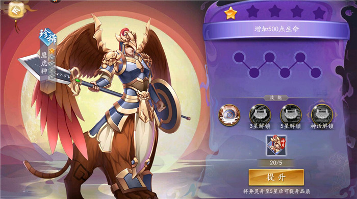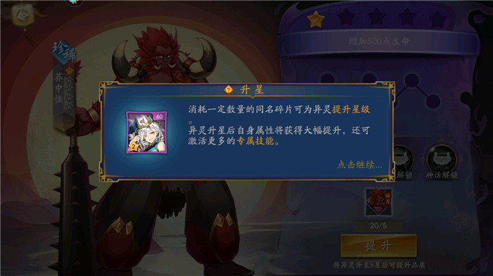 玩家在異靈的界面就可以看到升星和培養(yǎng)兩個按鈕,如果升星就點擊升星進入界面,每個異靈的起始星級都是1星,最高可以升到神話(6星),升星需要消耗一定數(shù)量的同名碎片就可以為異靈提升星級,異靈升星后自身的屬性將會獲得大幅的提升,還可以激活更多的專屬技能。