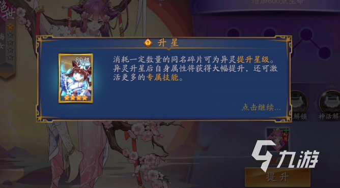 先來了解一下升星的操作,點(diǎn)擊進(jìn)入到異靈的培養(yǎng)界面中,選擇右側(cè)的升星喜選項(xiàng)之后就會(huì)來到升星的界面中。點(diǎn)擊升星界面下方的提升,消耗對(duì)應(yīng)的材料之后就可以完成升星的操作了,還是比較簡(jiǎn)單的。