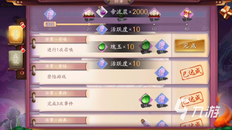 第二個方式可以通過活躍任務(wù)來獲得,活躍任務(wù)就是每日的一個任務(wù)玩法,是由很多個小任務(wù)來組成的。這些小任務(wù)都是很簡單的,在完成之后可以獲得對應(yīng)的獎勵。同時在活躍度達(dá)到四十點的時候還可以領(lǐng)取一百魂玉的獎勵,這個獎勵是每日都可以獲得的,只要動動手指做任務(wù)就行了。
