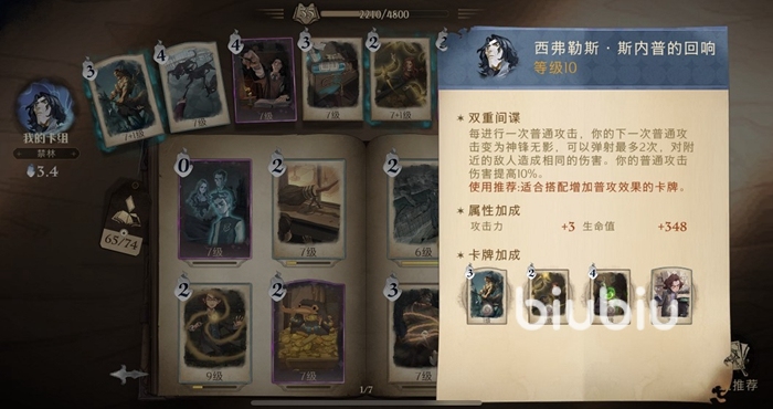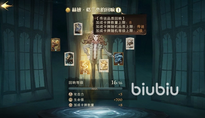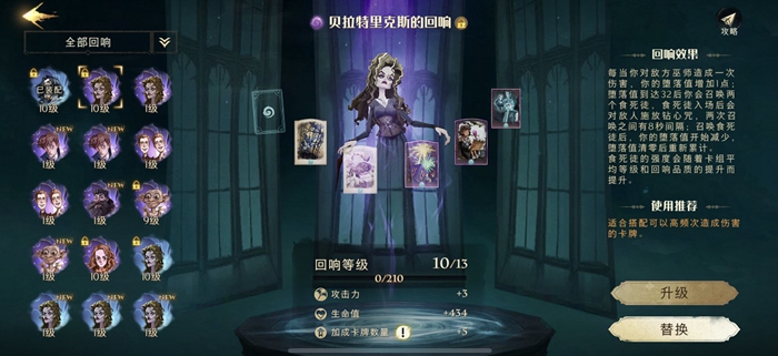 我們回到回響的管理界面,可以看到藍(lán)色、紫色以及金色的回響都一些卡牌進(jìn)行了加成。隨著回響品質(zhì)的越高,可以加成的卡牌越多,而藍(lán)色和紫色的回響可以為卡牌提供1等級的加成,金色的回響甚至可以對卡牌提供2級的等級加成。另外,相同的回響其加成的卡牌是不同的,而且是需要提升回響等級才會逐個解鎖的。所以在游戲中如何獲取高品質(zhì)并且加成卡牌也契合我們使用牌組的回響也是十分重要的。