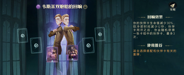 今天小編為大家推薦的一個(gè)非常適合月卡用戶(hù)上分使用的牌組。回響選用的是韋斯萊雙胞胎,這一套在我們伙伴卡使用完之后還有3次機(jī)會(huì)可以抽取到伙伴卡。伙伴卡我們選用了可以快速清除對(duì)方召喚物的卡珊德拉、以及回魔的洛蒂和治療的達(dá)尼爾。