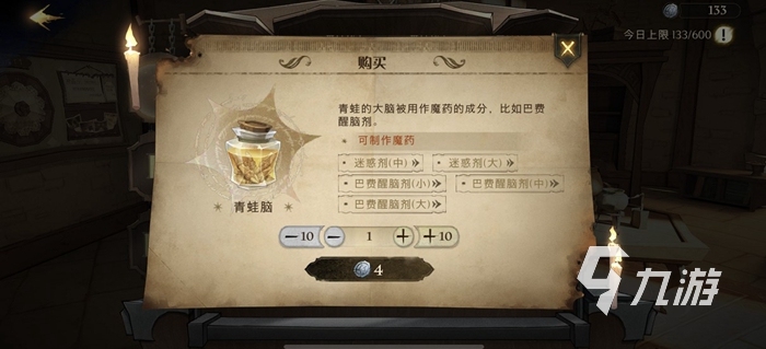 巴費(fèi)醒腦劑制作方法:首先我們要解鎖巴費(fèi)醒腦劑的配方,大家可以前往課堂兌換界面使用100課堂積分兌換到巴費(fèi)醒腦劑的小瓶配方或者是中瓶配方,而巴費(fèi)醒腦劑大瓶配方需要使用200個(gè)課堂積分。而制作材料以小瓶的巴費(fèi)醒腦劑為例,需要收集5份油以及4份青蛙腦。油大家已經(jīng)十分熟悉了,而青蛙腦同樣也是可以在禁林中獲取,或者使用4點(diǎn)課堂積分就可以購買了。