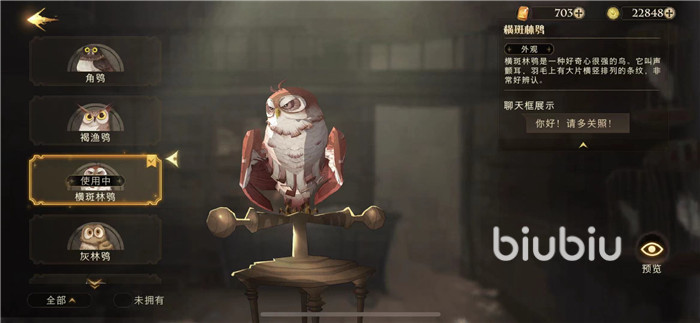 海格贈送的三只貓頭鷹分別是:角鸮、褐魚鸮以及橫斑林鸮,玩家可以在這三只中選擇其中一只。其實貓頭鷹的選擇對之后游戲的劇情任務(wù)都是沒有任何關(guān)系的,也不會給主角增加任何屬性,唯一的影響就是玩家聊天框,玩玩家選擇時候只需要點一下每只貓頭鷹看看右側(cè)的聊天框樣式即可。