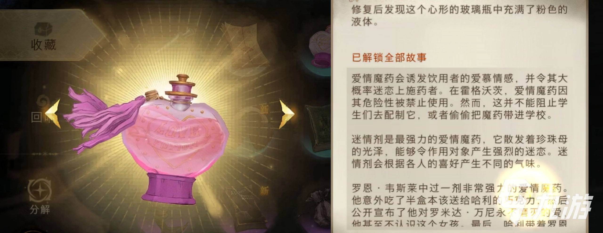 目前他的藏品只有一瓶愛情魔藥,在詳細(xì)信息介紹中是這樣說的,這瓶魔藥能夠又發(fā)使用者的愛慕情感,有大概率謎尚施藥者。在劇情故事中,羅米達(dá)曾經(jīng)送給哈利一盒巧克力,這顆巧克力被愛情魔藥的藥水浸泡過,后來羅恩吃掉了,剩下的半盒巧克力,在所有人面前,向羅米達(dá)表達(dá)了愛意。