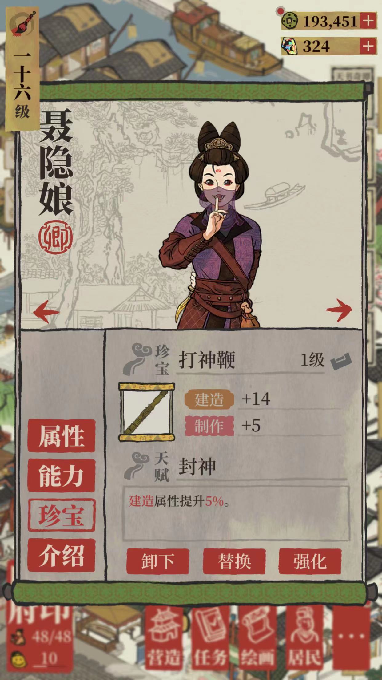 比如選擇聶隱娘后,通過查看詳情,可以查看到珍寶,在珍寶中通過選擇珍寶,可以看到通過珍寶花池所抽取到的珍寶信息,成功佩戴后,可以提升相應的角色屬性值。