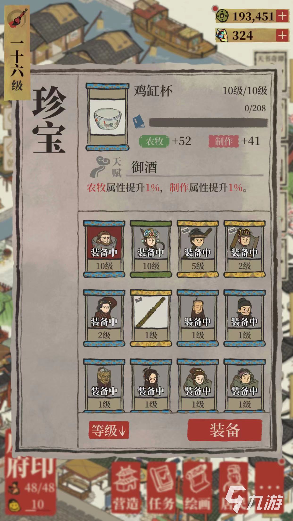 在珍寶花池中增加多種不同的道具,可以通過消耗卷軸進行抽取各種道具,有幾率獲得新增珍寶道具,其中包括算盤,玉璽,寶劍等,通過獲得的珍寶可以為相應的人物進行佩戴,提升人物等級。