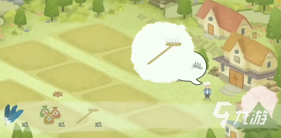 之后將找到的耙子給農(nóng)夫,然后他會開始耙地,這時玩家可以去找別的東西。往左邊的谷倉邊看會找到一包種子,再點擊雞圈中的大公雞會獲得一根羽毛,地圖中秋千的旁邊有一顆小樹苗可以獲取。