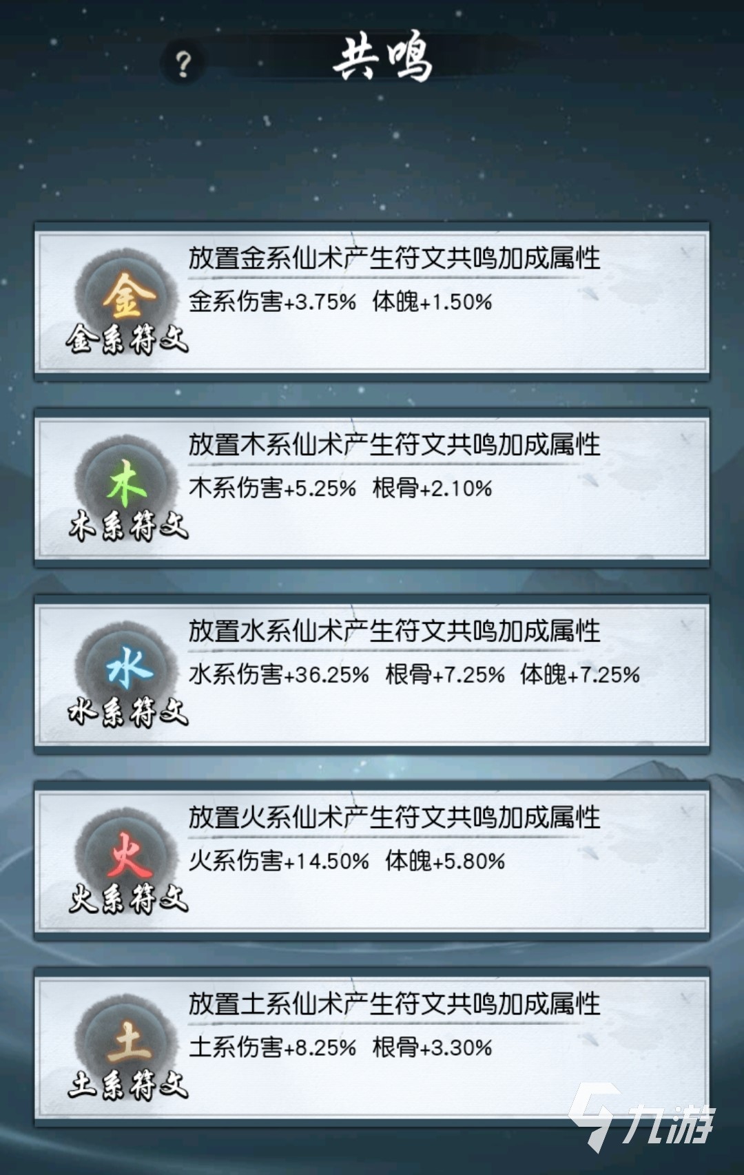 另外,玩家在進(jìn)行仙術(shù)調(diào)整的時候一定要考慮到共鳴的影響,要把共鳴屬性多的仙術(shù)放在最前面,例如下面圖上的共鳴就是水屬性的加成最高,玩家就可以把水屬性的仙術(shù)放在最前面,這樣可以打出最高的傷害!