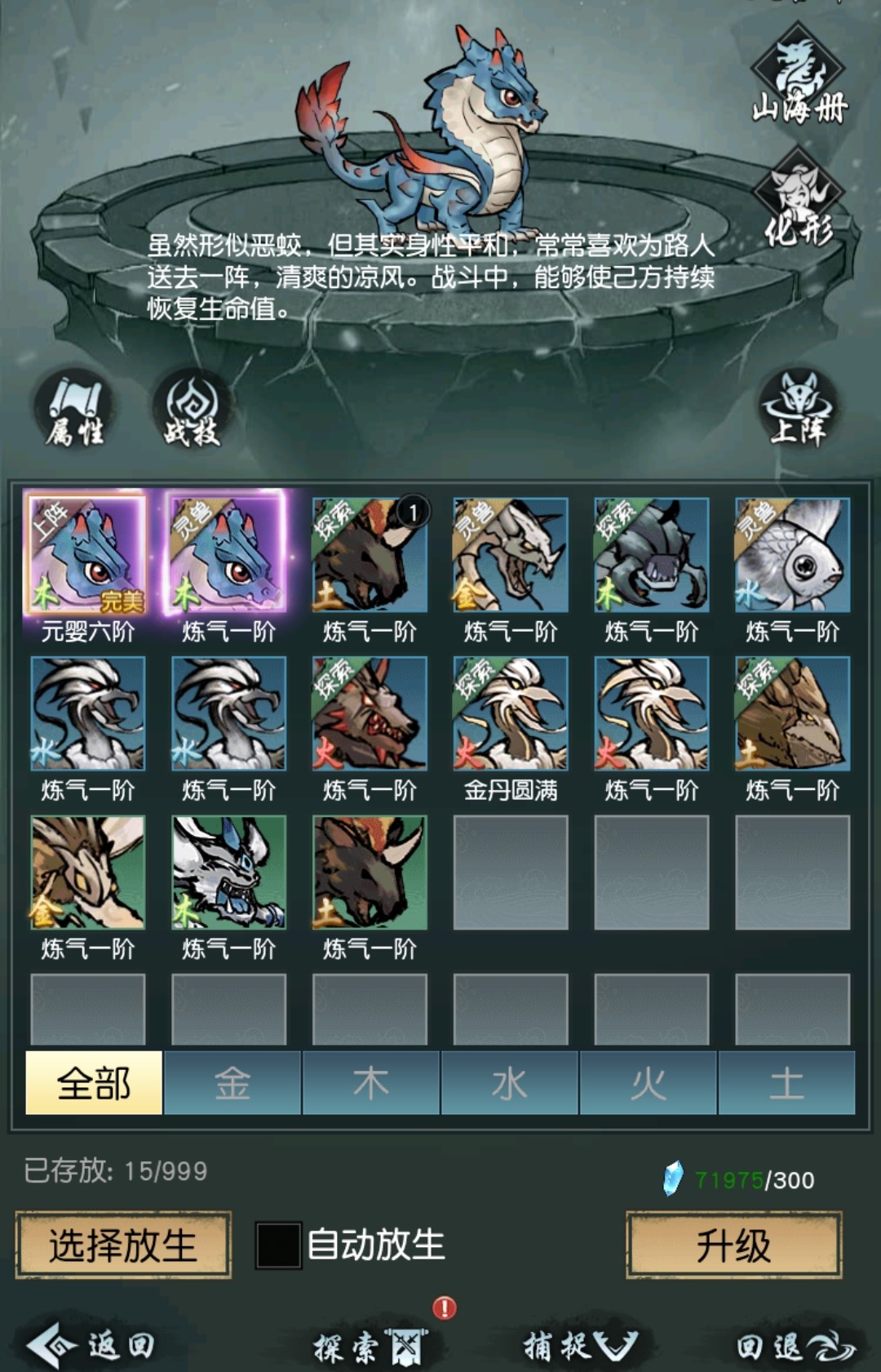 在靈寵界面里,玩家可以看到自己已經(jīng)獲得的所有靈寵以及它們的等級(jí),在界面的底部,玩家可以看到有放生按鈕,玩家放生掉靈寵可以獲得五靈之氣,五靈之氣可以用來給靈寵升級(jí)哦!
