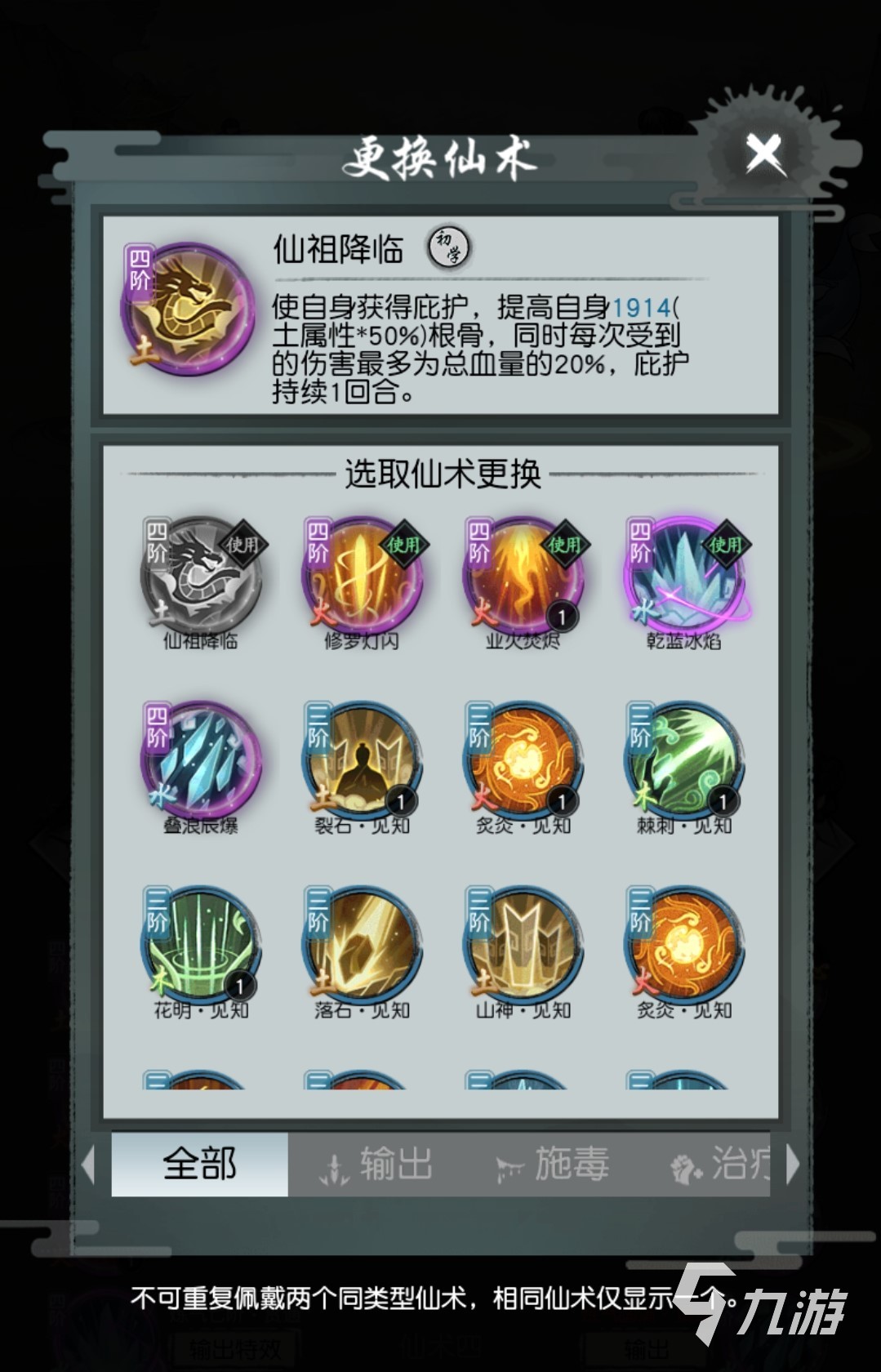 這里推薦玩家們一定要放置佛祖降臨這個土屬性的仙術,因為它的效果很強,可以在接下來的一回合內使玩家受到的傷害最多只有生命值的五分之一,可以很好的保護玩家不被秒殺!