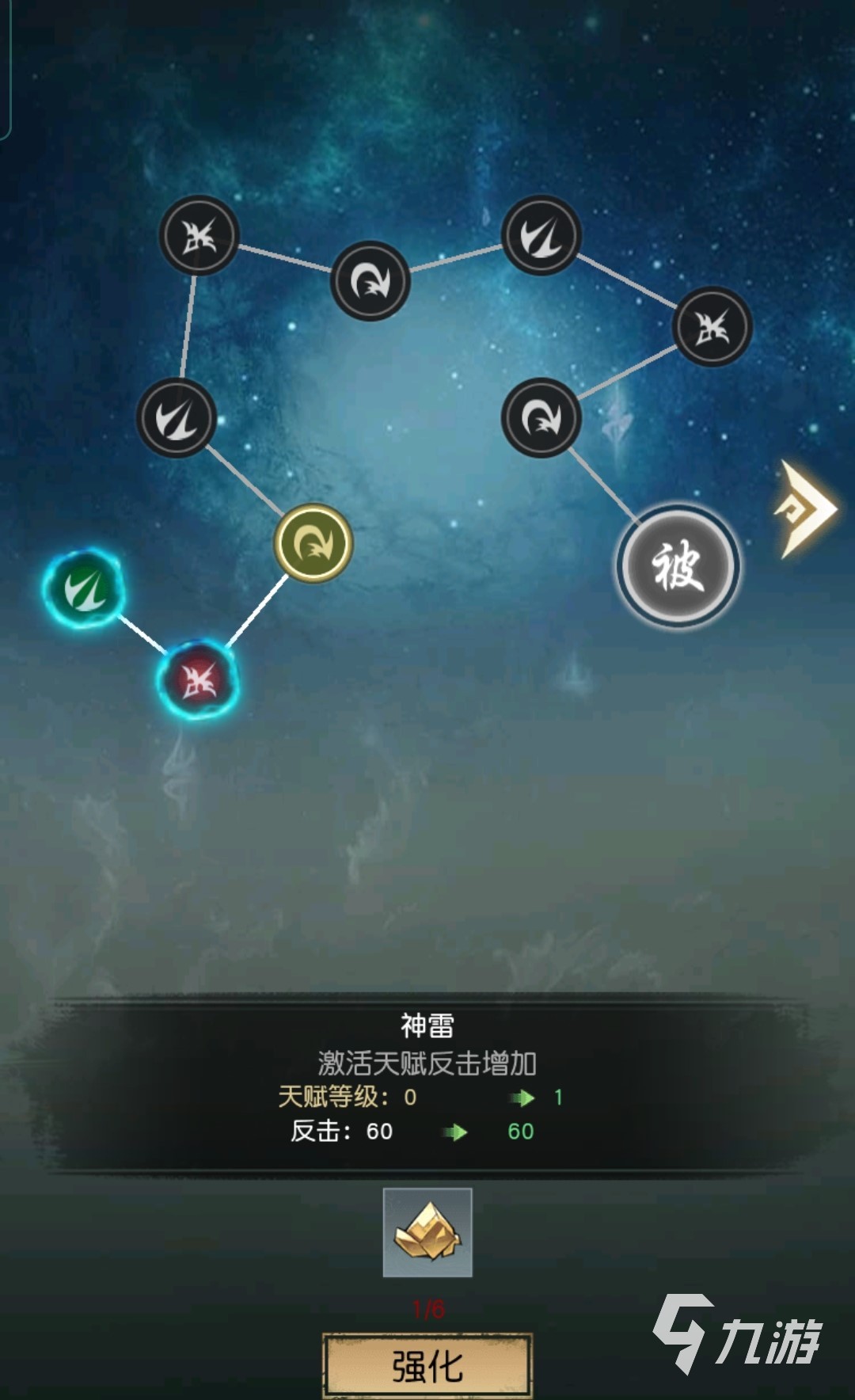 玩家可以在天賦界面可以看見天賦的名字和增加的屬性,比如這個就是神雷,加的屬性是加六十點的反擊,還是很不錯的屬性,玩家們要根據(jù)自己需要加強的天賦來進行強化哦!