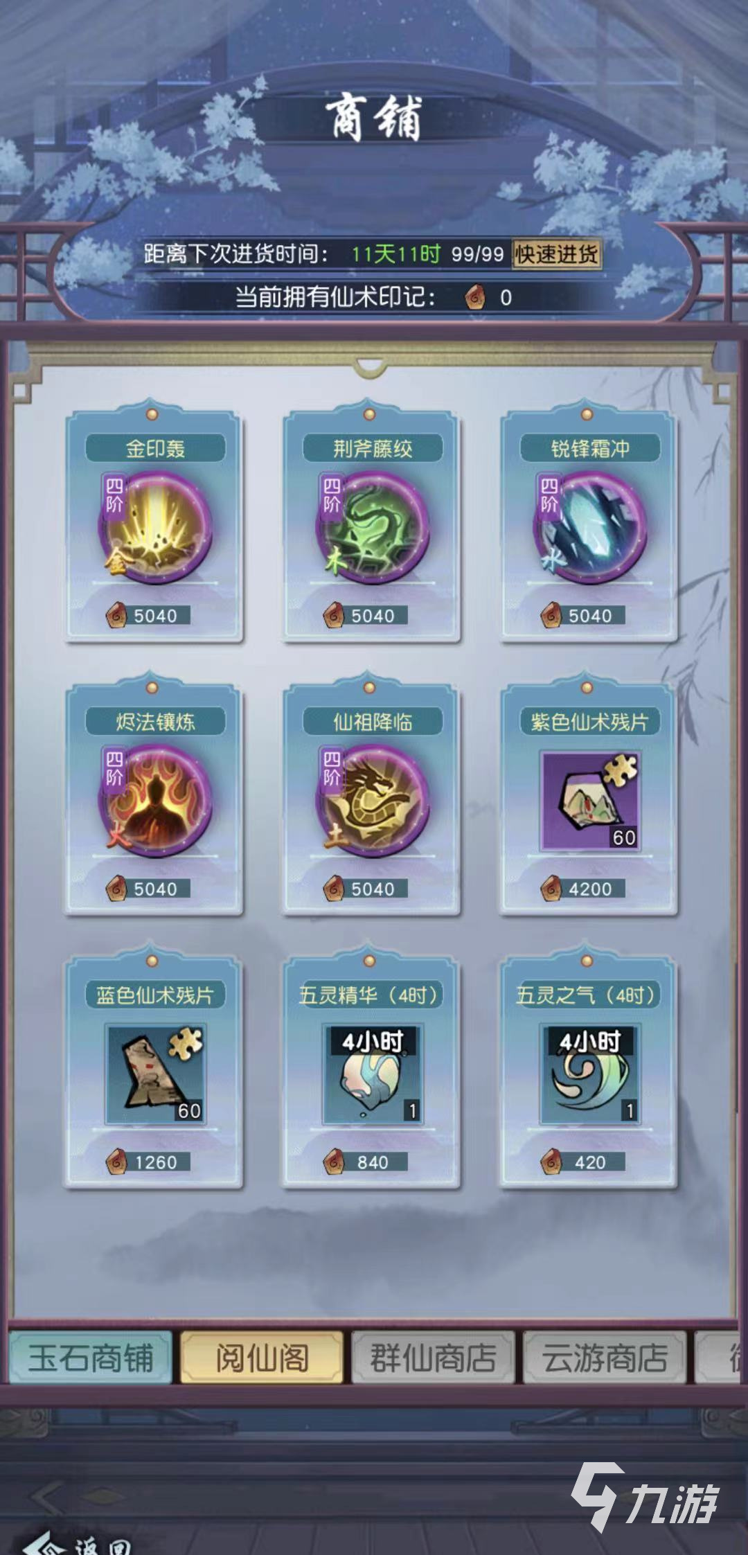 藍(lán)色仙術(shù)殘片的獲取用途有以下幾種方式,第一種方式要求玩家前往界面右上方的商店進(jìn)入,里面分別有玉石商鋪,閱仙閣,群仙商店,云游商店等等,點(diǎn)擊閱仙閣就可以看見藍(lán)色仙術(shù)殘片了,玩家需要用少量的印記道具來進(jìn)行購買。