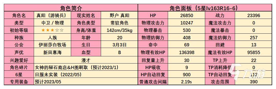 屬性如圖所示,技能方面ub能對前方825范圍的敵人造成物理傷害并混亂6秒。1技能提升攻擊力,每秒自充15tp,持續(xù)12秒。專武后可以根據(jù)敵人的數(shù)量來提升技能buff量,并追擊暴擊。