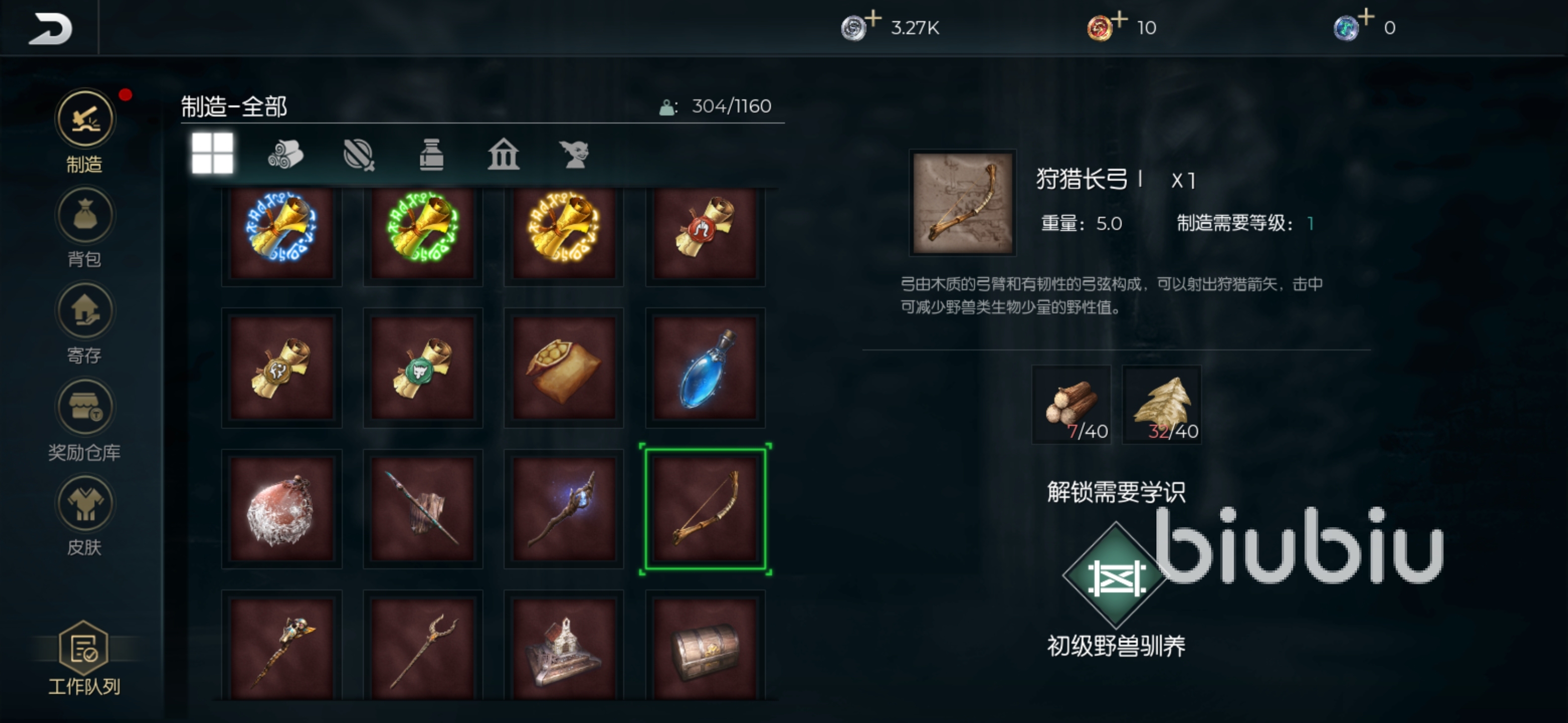 在游戲內(nèi)還有很多能夠減少動物野性質(zhì)的裝備,比如說骨矛就是一把常見的狩獵兵器,比較方便攜帶,而且傷害比較高,需要使用30個木頭和45個骨頭來進行制作,如果沒有專業(yè)的誘捕長弓,可以使用狩獵成功來進行替代,需要使用40個木頭以及40個骨皮來進行制作。