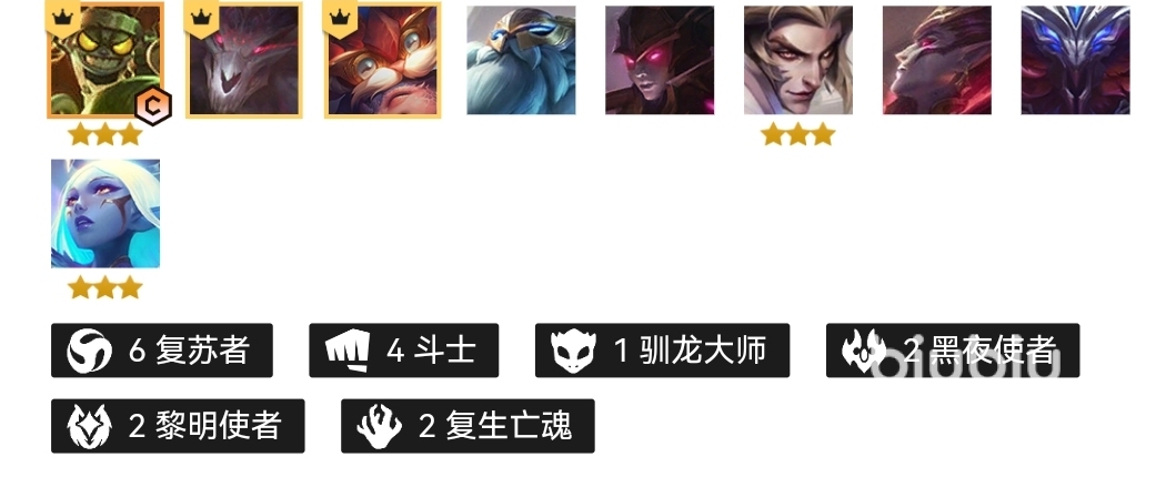 復(fù)蘇者努努由9人口組成,帶復(fù)蘇者轉(zhuǎn)職的努努,大頭,洛,吸血鬼,翠神,奶媽一共組成6復(fù)蘇者。努努,狗熊,酒桶,豬妹組成4斗士,這樣的羈絆,努努的HP以及回復(fù)能力都是到達(dá)了最高了。最后翠神和狗熊組成復(fù)生亡魂,提高陣容容錯(cuò)率。