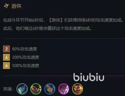 此時(shí)玩家可以想到另一個(gè)羈絆-游俠,游俠英雄在戰(zhàn)斗中每4秒可獲得持續(xù)4秒的高額攻速加成,其中6游俠更是能提供500%的攻速加成,如果把天使變成游俠,那么天使不就可以輕松抽搐一扇一大片了嗎?