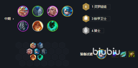 陣容早期可以過渡的方向會(huì)比較多,比較合適的陣容可以采用喪尸體系過渡。從后期陣容的成型結(jié)構(gòu)來看,需要的4~5費(fèi)卡比較多,占了5張,所以早期選打工陣容盡量選擇前期強(qiáng)、能掛裝備吃連勝的陣容來打。等5~6人口的階段可以考慮豬妹、錘石等牌不上來,去往4騎士的方向補(bǔ)強(qiáng)。