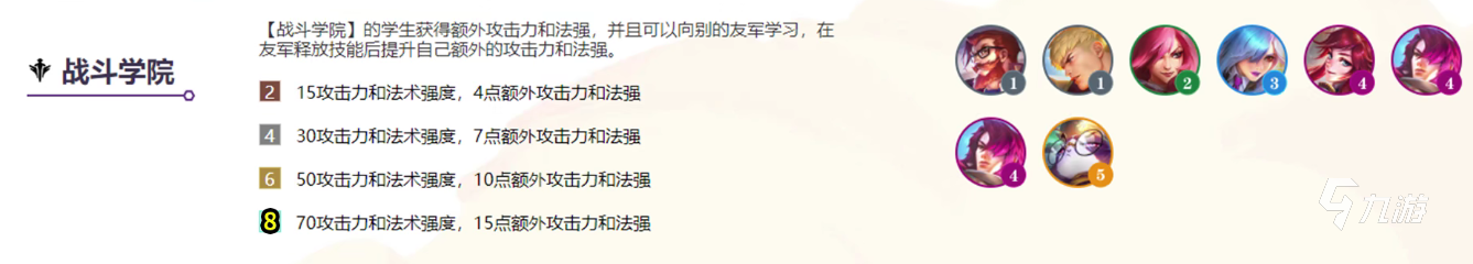 云頂之弈S6賽季戰(zhàn)斗學(xué)院羈絆一共是有七個(gè)人的,分別是男槍,蓋倫,卡特,雷歐娜,光輝,永恩和貓咪這七位英雄,羈絆的效果是英雄可以獲得一定的攻擊力和法強(qiáng),在隊(duì)友使用技能之后的話能夠?yàn)樽约禾峁┮欢ǖ墓袅头◤?qiáng),有點(diǎn)類似于之前的三國(guó)羈絆效果。
