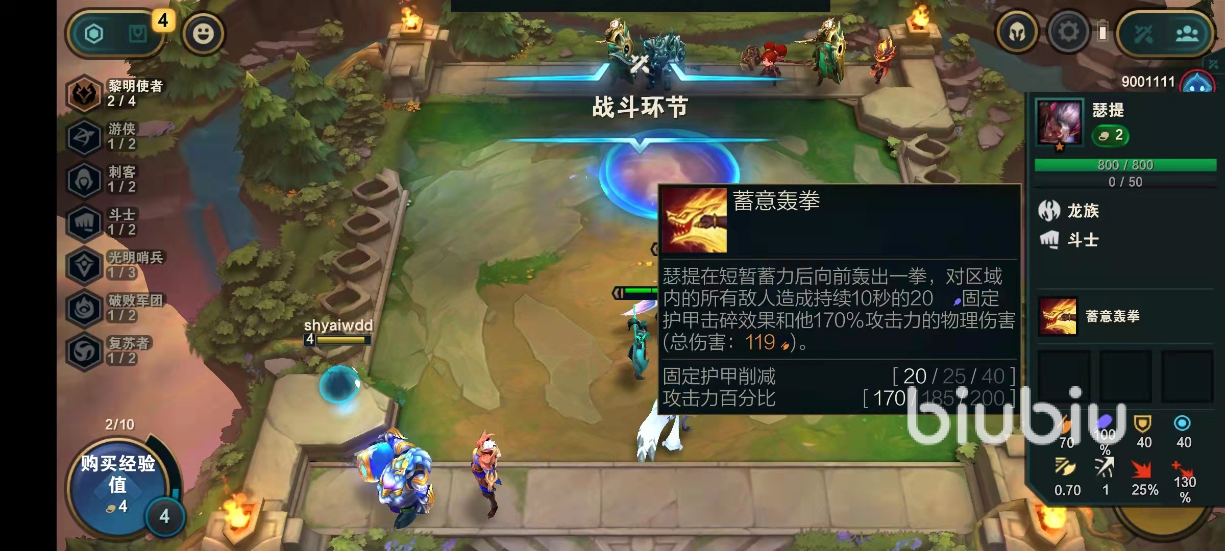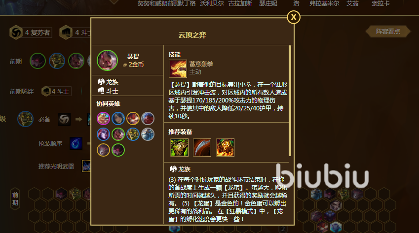 腕豪瑟提的技能蓄意轟拳,效果是可以對目標(biāo)發(fā)出一道錐形的沖擊破,所有區(qū)域內(nèi)的敵人都會受到物理傷害,并且降低傷害目標(biāo)的護(hù)甲值。除了技能外,瑟提還是屬于龍族的斗士英雄,龍族的特點(diǎn)是可以獲得一顆龍蛋,孵化出稀有的戰(zhàn)利品,斗士的羈絆效果是增加額外的生命值。