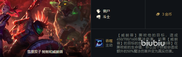 這套陣容中需要將努努轉(zhuǎn)職為復蘇者,從而組成6復蘇者羈絆,6復蘇者羈絆每秒恢復10%最大生命值,如果生命值已滿時則法力值。努努的續(xù)航能力非常強,而且釋放技能的頻率也非常高,不斷通過技能來吞噬對手,如果目標的當前生命值小于努努時,努努的技能傷害會提升50%,并且轉(zhuǎn)化為真實傷害,非??酥颇切┮约永飱W、蓋倫等單一前排的坦克的陣容。