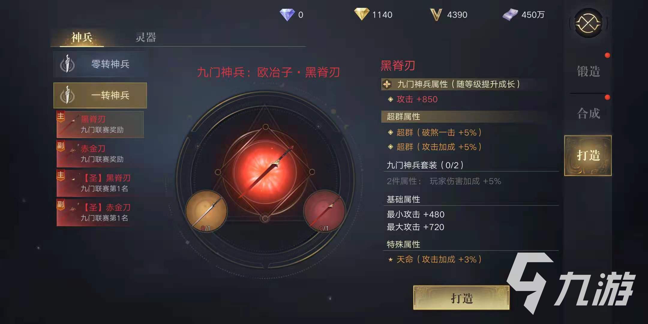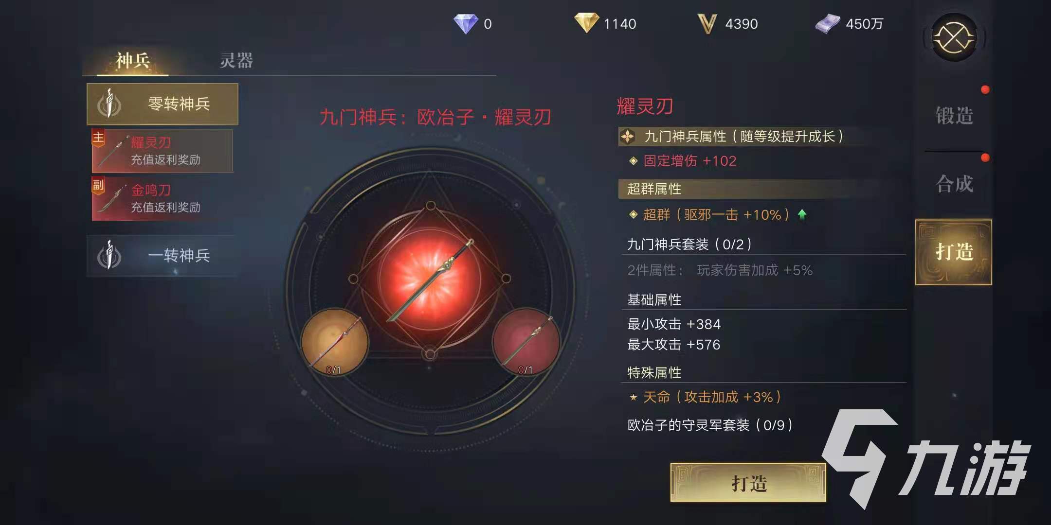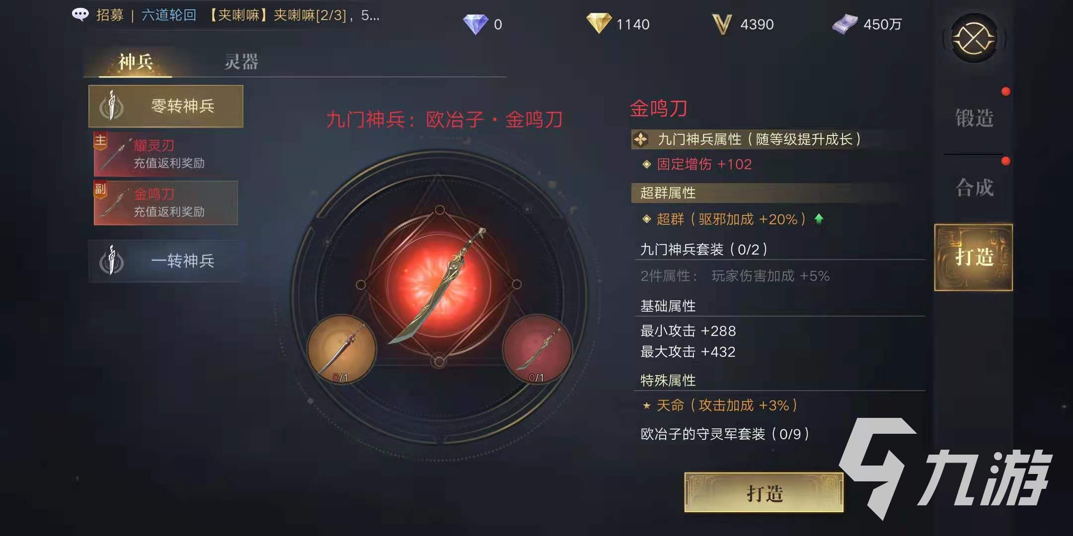 其次是副刀金鳴刀,雖然它的基礎(chǔ)屬性要略遜耀靈刀,但是相比其他紫色武器還是比較高級的。除了打造之外,耀靈刀、金鳴刀還可以通過充值返利獎(jiǎng)勵(lì)獲得。另外,金鳴刀的打造材料分別是橙色和紅色等級的劈山刀,打造裝備后可以隨角色等級提升成長。