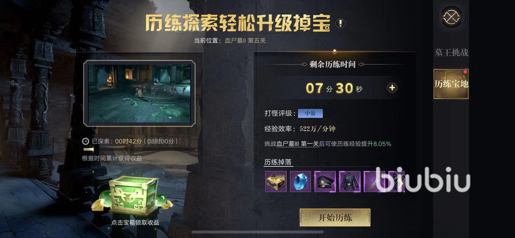 而其中小編給大家推薦【歷練寶地】這一任務(wù),在這個(gè)任務(wù)中分為兩個(gè)歷練,一個(gè)是墓王挑戰(zhàn),另一個(gè)是歷練寶地。玩家每通過一關(guān)的墓王挑戰(zhàn),都可以提升每分鐘在歷練寶地得到經(jīng)驗(yàn)的幅度。簡(jiǎn)單來說就是你通過的關(guān)卡越多,在歷練這里你可以得到越多的經(jīng)驗(yàn)。小編突破130級(jí)就是主要刷這個(gè)任務(wù)得到大量經(jīng)驗(yàn)的。