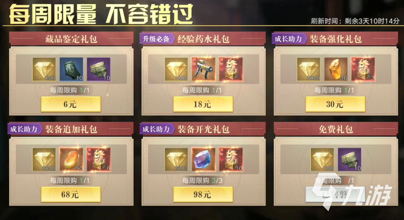 3.至于每周禮包,小編并不推薦買藏品鑒定禮包,另一個經驗藥水禮包才是值得購買的,只要花費18就能夠得到經驗藥水(7天)、麒麟寵物禮包和1800金鉆。