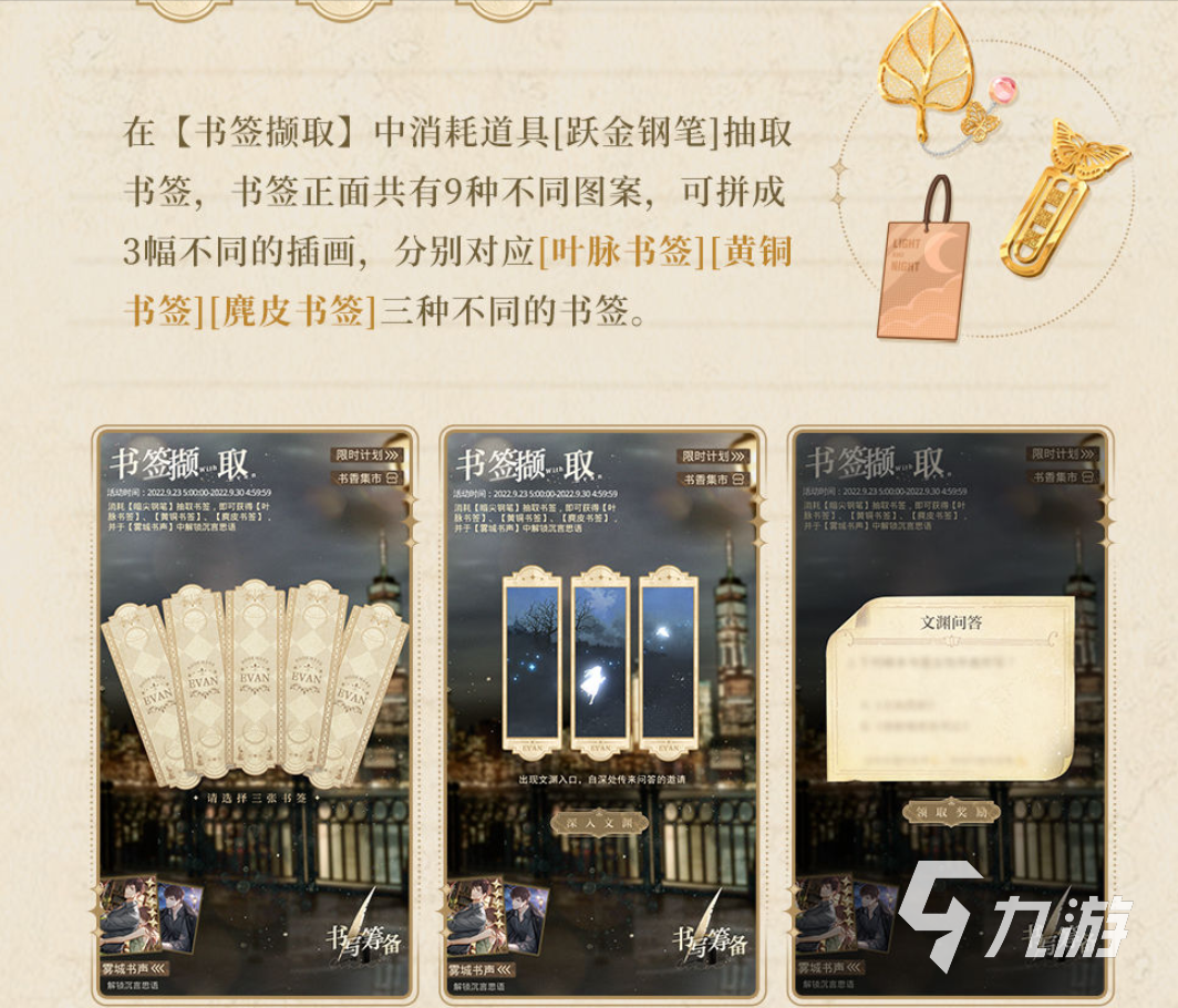 與書簽相關(guān)的活動是,需要玩家使用上面活動中提到的道具來抽取書簽。這里的書簽一共有九種不同的圖案,可以每三組就可以組合成一個完整的插畫,也分別對應(yīng)了不同的立體書簽。