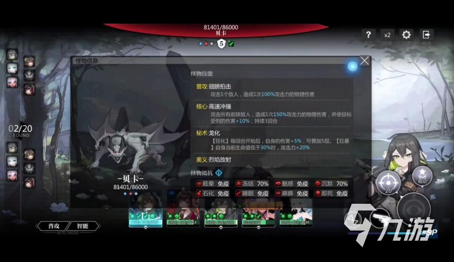 5-6關(guān)卡怪物弱點(diǎn)主要就是火焰,推薦玩家們達(dá)到14萬(wàn)戰(zhàn)力進(jìn)行挑戰(zhàn),但是小編這里有一個(gè)技巧,達(dá)到10萬(wàn)就可以試一試。首先要分析一下boss的攻擊模式,來(lái)做出相應(yīng)的陣容選擇,Boss會(huì)在一定階段之后選擇吐火,使用爪子進(jìn)行攻擊,并且使用身體進(jìn)行撞擊,每個(gè)回合都可以增加5%攻擊力的buff,在他殘血之后,還會(huì)增加20%的攻擊力,主要攻擊方式就是吐火,爪擊,兩次撞擊,再吐火進(jìn)入循環(huán)。
