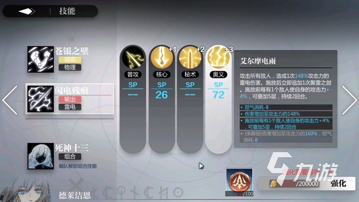 死神的普攻銀色鋼腕可以攻擊1個前排的敵人,并且造成100%的物理傷害。雷電技能閃電殘痕同樣也是攻擊1個前排的敵人,可以對敵人造成100%雷電傷害。雷電核心技能超電能躍擊能夠攻擊全體敵人,造成80%攻擊力的雷電傷害,并且使自身的雷電傷害得到10%的加成,該效果持續(xù)三個回合。雷電秘術(shù)聚雷之劍,釋放后我方角色每釋放一次雷電傷害技能之后死神都可以獲得一層儲能,在儲能得到6次時可以自動釋放雷電能量,并且對所有的敵人造成攻擊力50%的雷電傷害。