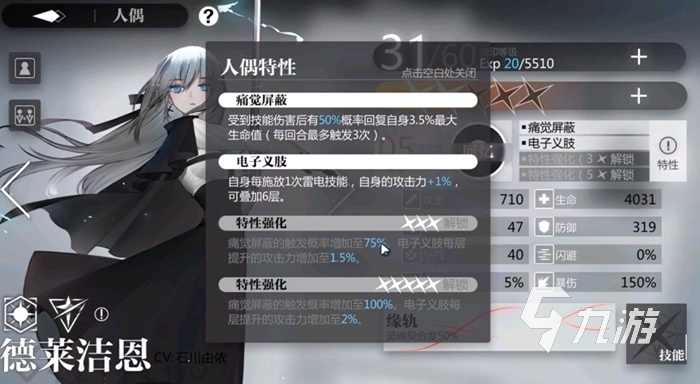 特性強化1:激活后痛覺屏蔽的觸發(fā)概率增加到75%,電子義肢每一層提供的攻擊力加成變?yōu)?.5%;特性強化2:痛覺屏蔽100%觸發(fā)、電子義肢每一層的效果提高到2%。