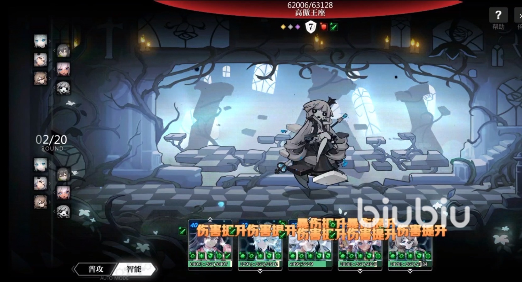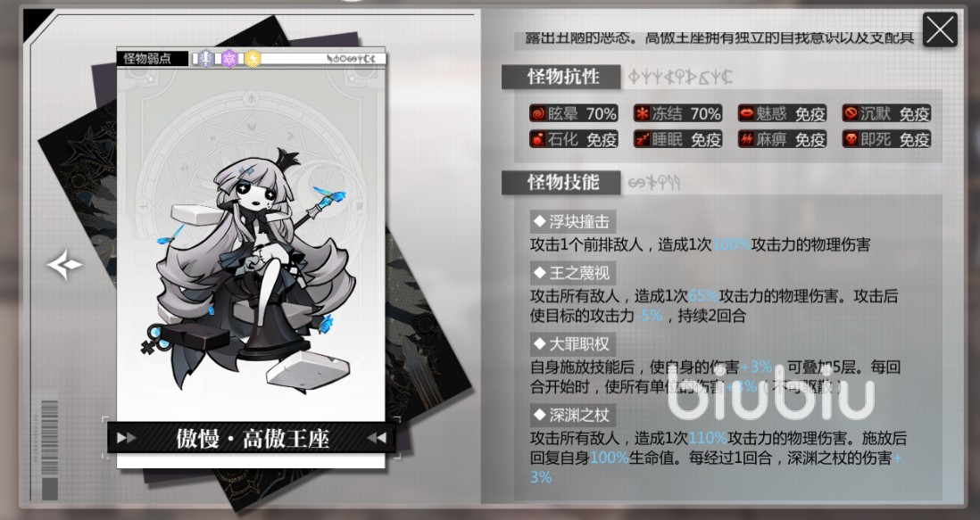 高傲王座的難點在于他會無限吸血,好不容易打到半管血,一不注意又讓他給回滿了,通過回血來消耗我方隊伍。所以打高傲王座boss最關(guān)鍵在于能夠打斷boss的回血或者讓他不回血,那么帶一個有控制技能的角色就非常有必要了。