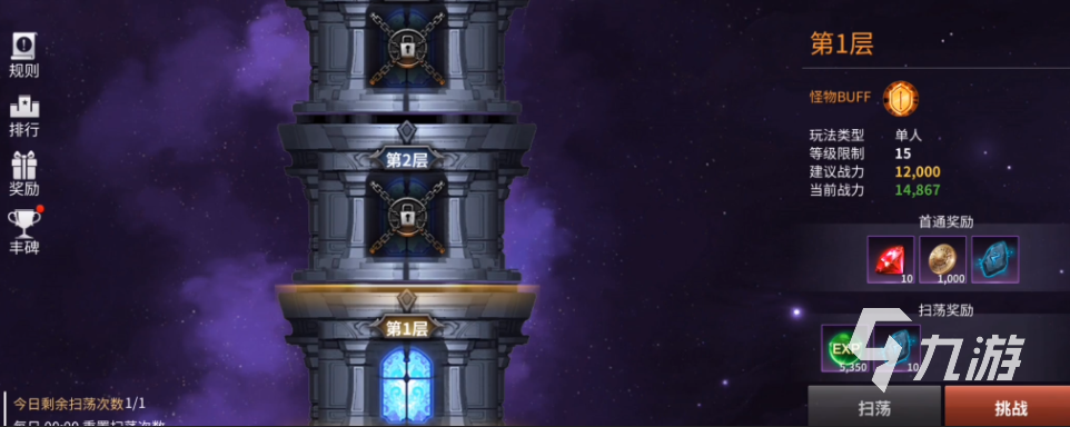 先來看一看基本的設定,基本設定就是單人的一個玩法,只有單人可以進入,同時每日只有一次的挑戰(zhàn)機會,失敗的話就無法再次進入了,只有等待第二天的刷新之后才行。第二天的挑戰(zhàn)如果說實力提升不多的話,可以直接選擇掃蕩來獲得獎勵,可以直接獲得最大層數的獎勵。