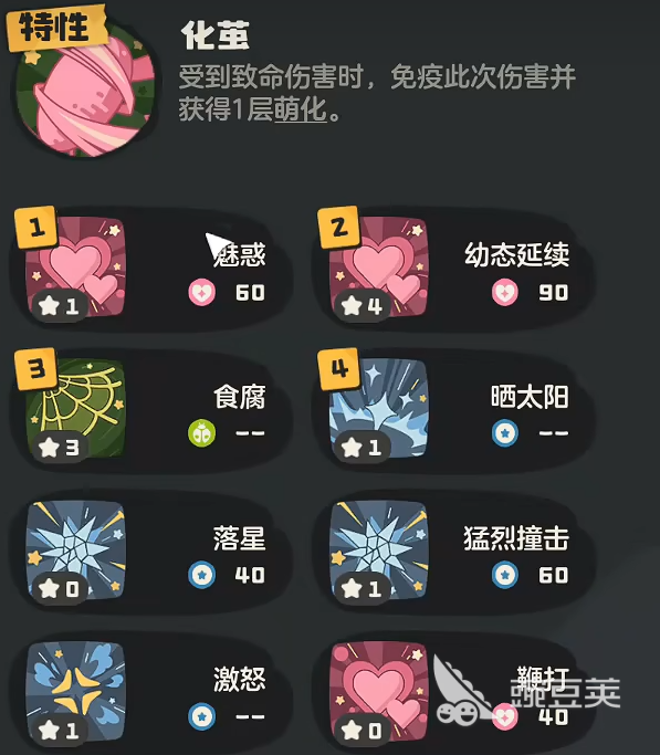 化蝶是這款游戲里面很有趣的一個精靈,這個精靈本身的樣子有一些憨態(tài)可掬,整體為蟲和萌兩種屬性。關于性格大家可以選擇提升它自身魔攻或者是速度的性格比較好,它在這兩個屬性方面是存在短板的,所以在性格上要進行補足才行,所以推薦選擇這兩個性格。
